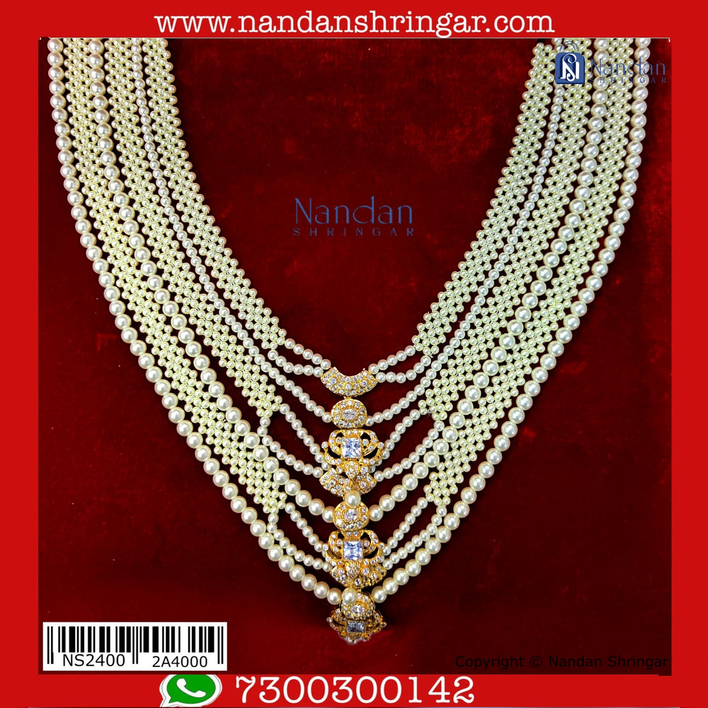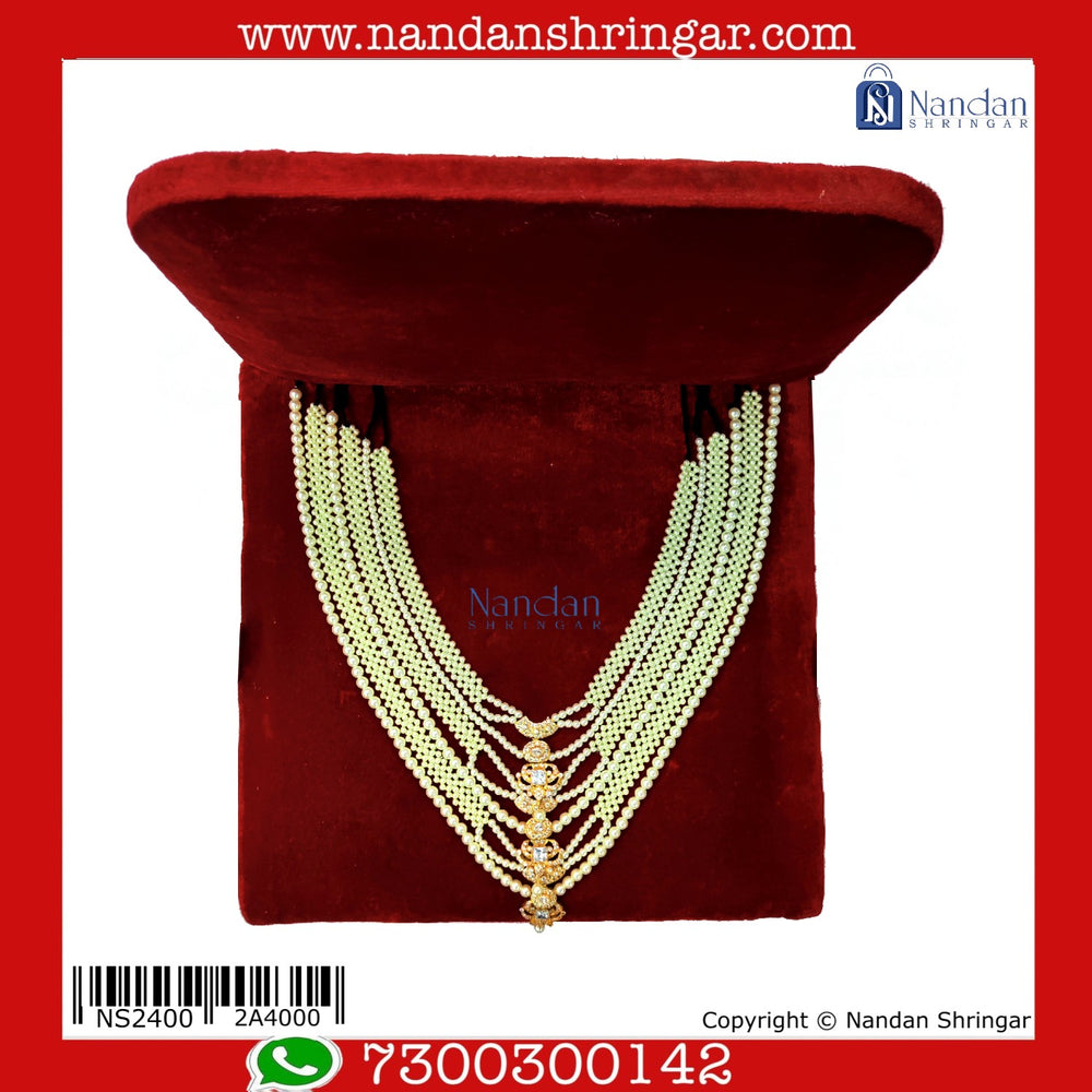 Product ke hisaab se material hota hai jaise AD, real pearl, kundan, silver polish, meenakari, etc. Detail product description me di hoti hai.